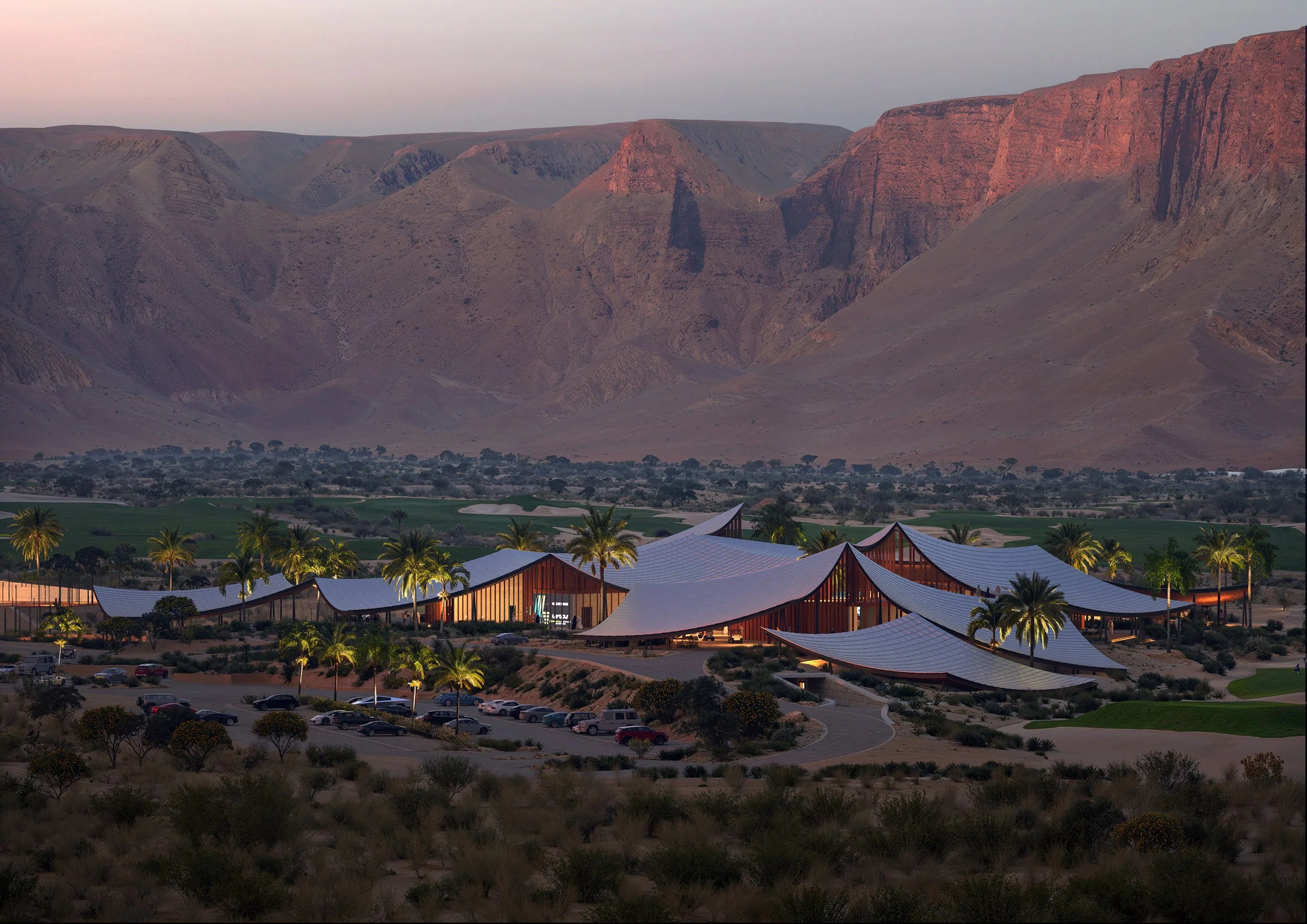 Outdoor scene at dusk with a modern building with curved roofs, illuminated interior, and a gathering of people inside and outside. Mountain range in the background under a full moon.